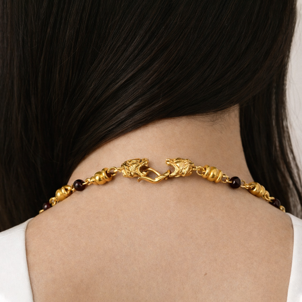 Με μάκρος 80 έως 90 πόντων, τον χρυσό και κόκκινο τόνο σαν χαρακτηριστικά της περιοχής και της εποχής, το μοντέλο έχει λιτό και απέριττο σχέδιο κλείνωντας στο κούμπωμα με δύο θηρία.